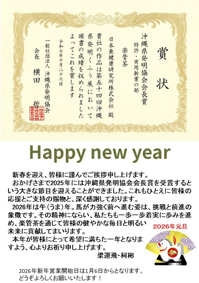 日本亜健康研究所株式会社は、自然療法センターにて、個人向けの健康プログラムなどを実施しています。また、研究開発としまして、自社開発の健康茶「楽管茶」の販売を行っております。