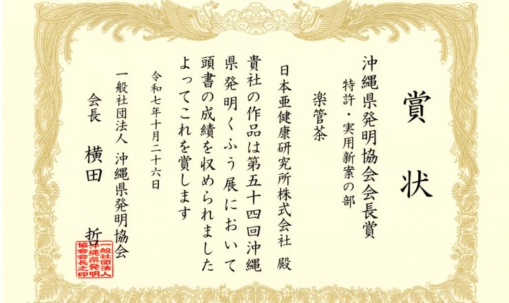 10月26日、「第54回県発明くふう展」の表彰式が那覇市県立武道館で開催されました。 弊社の「楽管茶」は「特許・実用新案」の部において、発明協会会長...