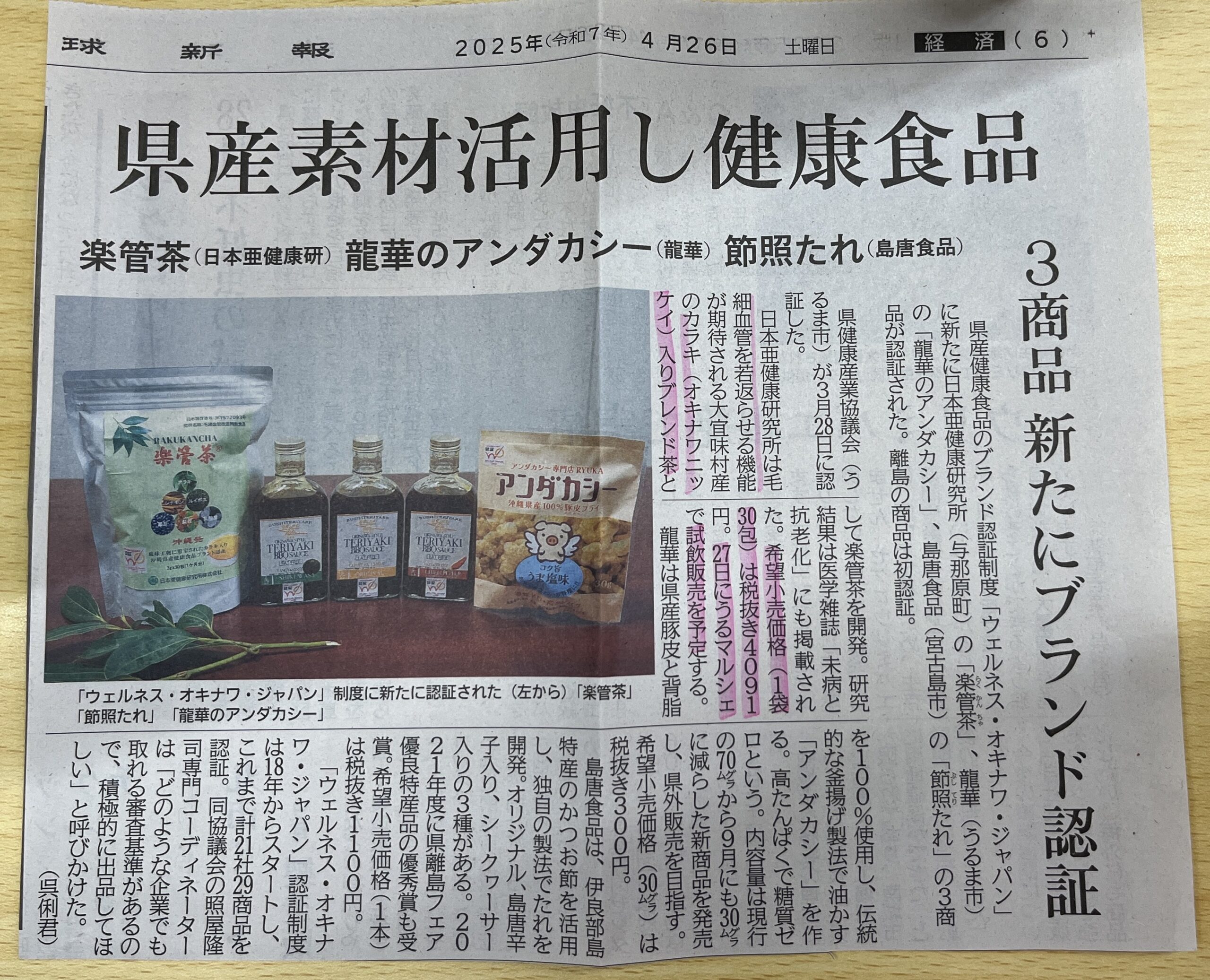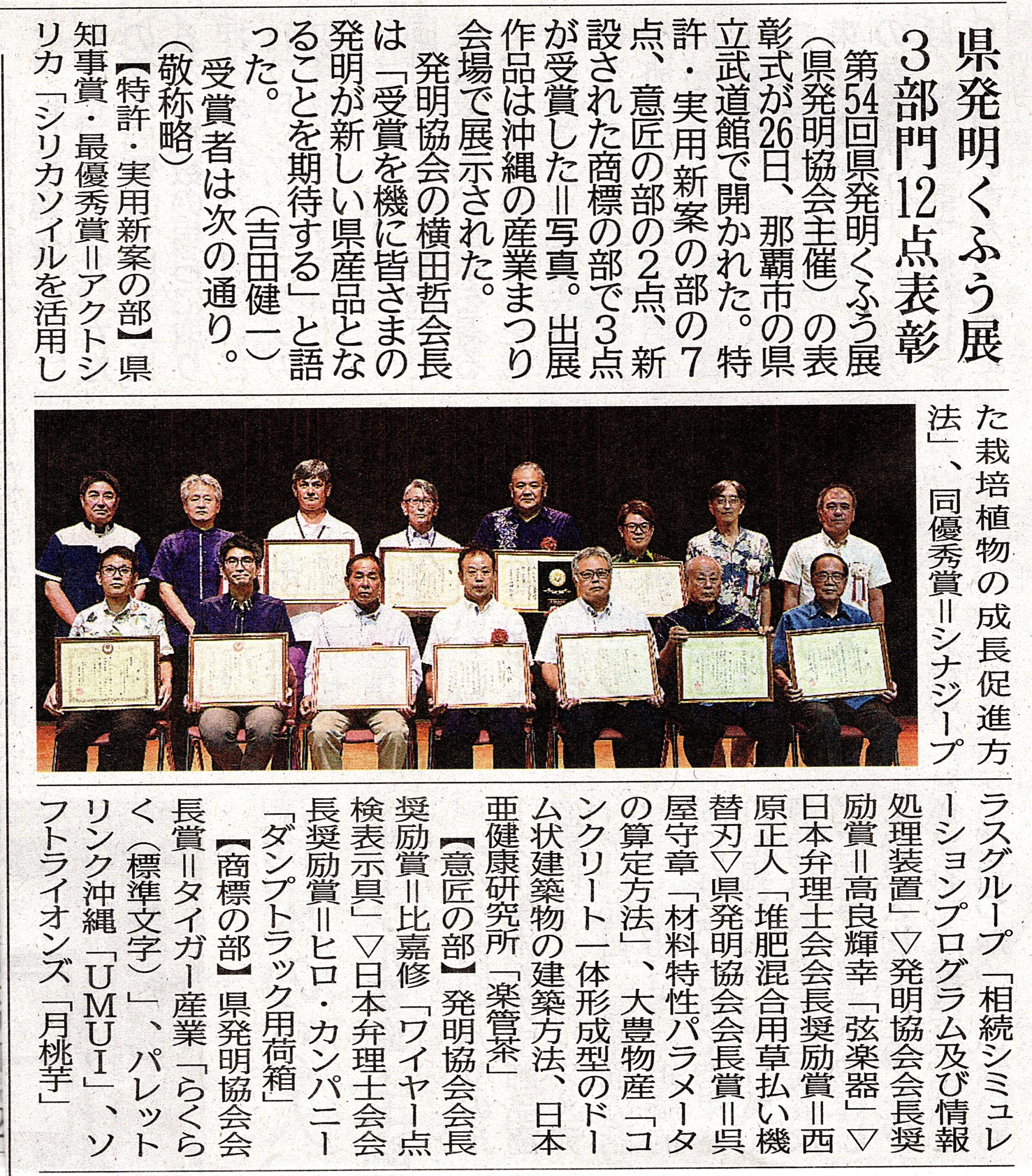 メディア掲載 「第54回県発明くふう展」発明協会会長奨励賞を受賞 2025.11.04 10月26日「第54回県発明くふう展」発明協会会長奨励賞を受賞新聞にも掲載されました。 詳細はこちら Post Share Hatena RSS 「第49回沖縄の産業まつり」ブース出展 「日本商品展示会」中国・大連