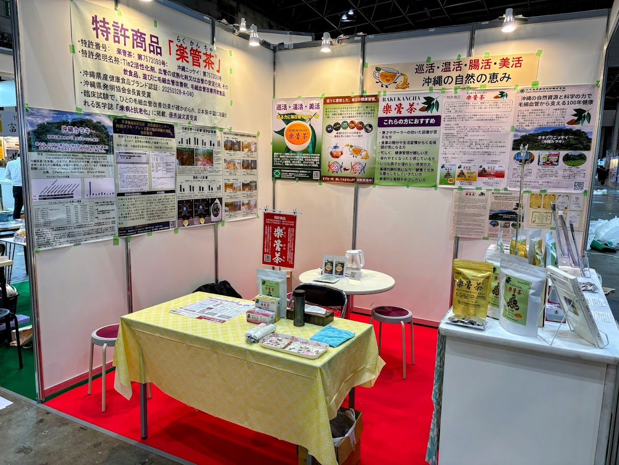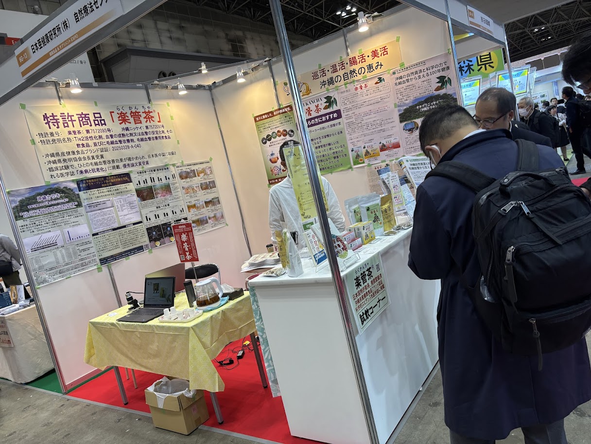 与那原町商工会の補助金事業のご支援をいただき、私たちは初めて東京ビッグサイトで開催された健康博覧会に出展し、「楽管茶」の展示を行うことができました。